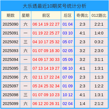 开奖回顾:第2025099期大乐透开奖号码为:06、12、20、26、31+02、04。奇偶比为1:4,012路比为2:1:2。